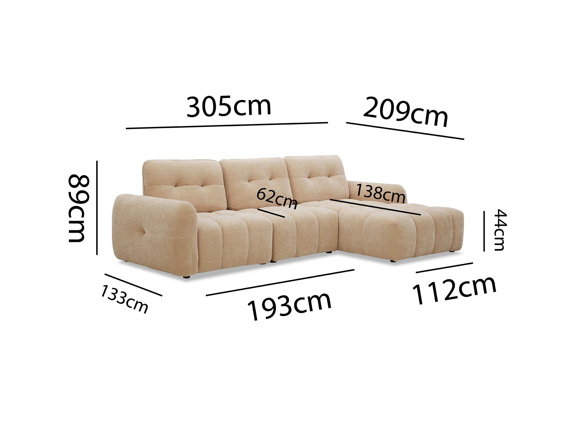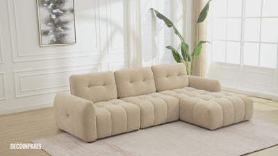 Le canapé d’angle ADONIS est un canapé d’angle moderne conçu pour offrir un bon confort d’assise et une flexibilité d’utilisation. Son revêtement en velours tissé beige apporte une texture agréable au toucher et s’intègre facilement dans un salon contemporain ou plus classique.