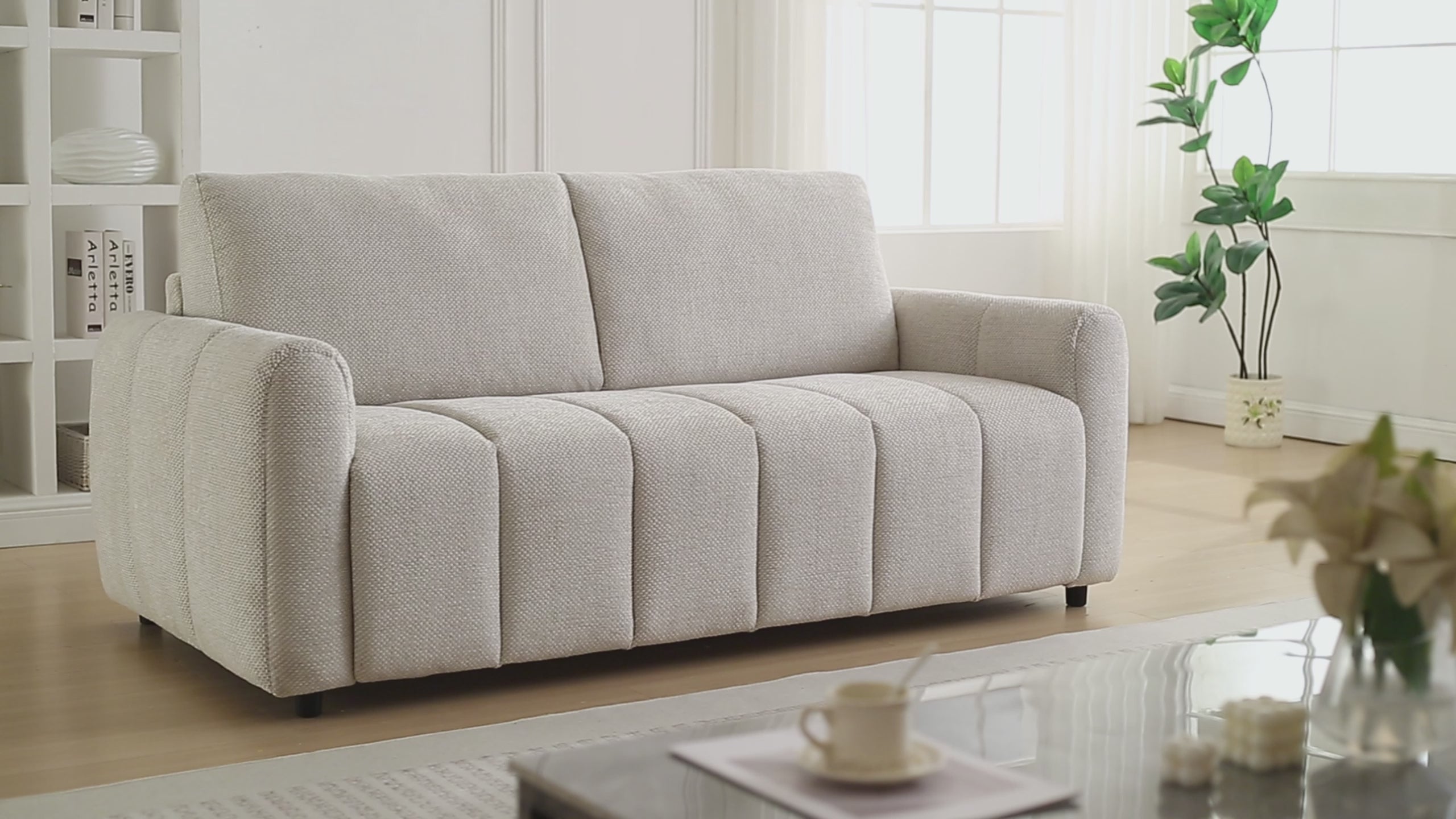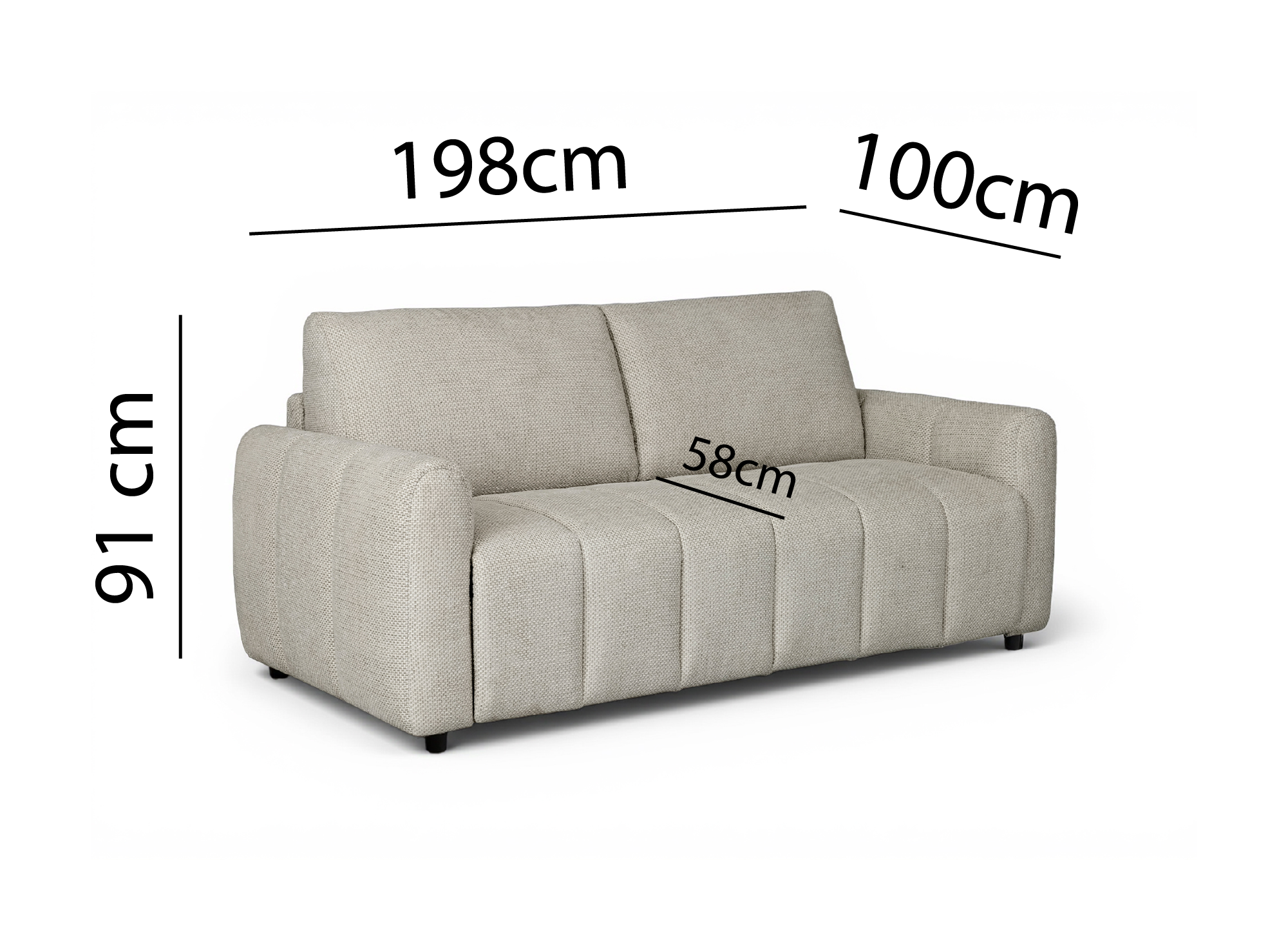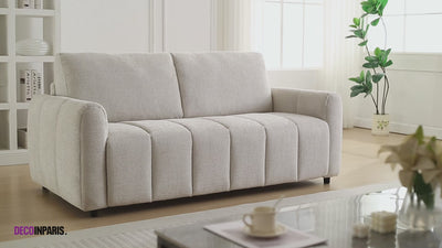 Mit seinem strukturierten Design und der warmen Silhouette ist das ISANDRO Schlafsofa ein echtes Highlight, das Ihr Wohnzimmer aufwertet und gleichzeitig für komfortables Schlafen sorgt. Der weiche beige Stoffbezug und die vertikalen Nähte verleihen ihm einen modernen und einladenden Look.