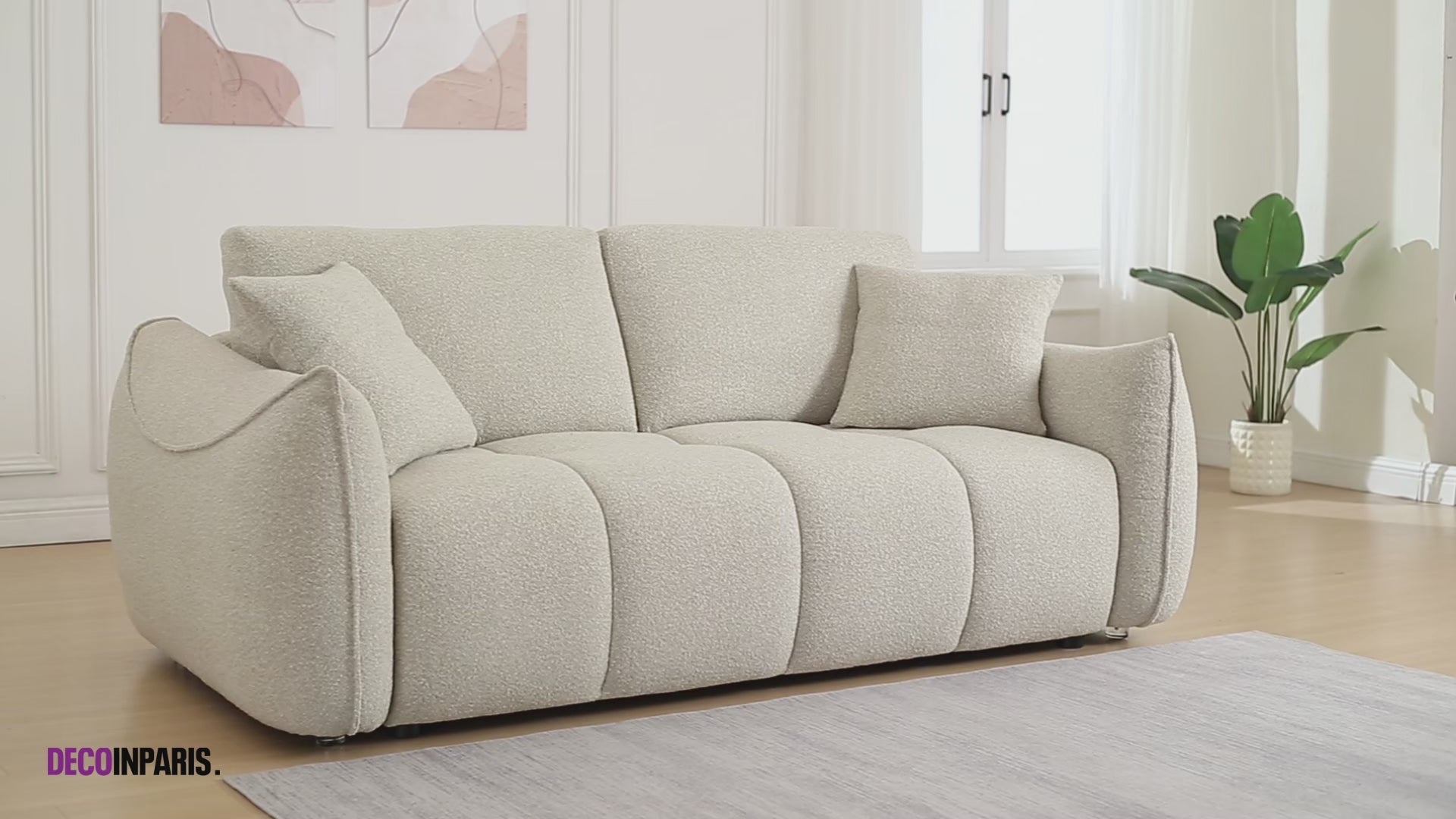 Das Sofa EZRA ist mit einem Stoff in Bouclé-Optik bezogen und bietet eine weiche, angenehme Textur, perfekt für Ihre Momente der Entspannung. Die großzügig gepolsterte Rückenlehne, die Sitzfläche mit hoher Dichte und die geschwungenen Armlehnen passen sich Ihrer Körperform an und bieten optimalen Komfort.