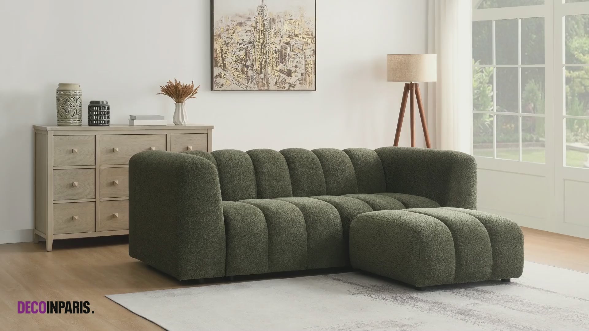 Zusammenfassend lässt sich sagen, dass das 3-Sitzer-Sofa AELIS aus grünem Bouclé-Stoff eine sichere Wahl für alle ist, die nach diskreten, warmen und bequemen Möbeln suchen.