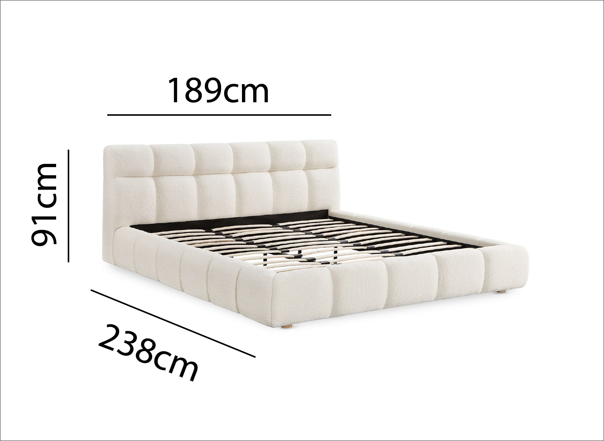 Die weiche Bouclé-Stoffpolsterung in einem schicken Ecru-Ton verleiht jeder Inneneinrichtung einen Hauch von Raffinesse, während das gepolsterte Kopfteil eine warme und gemütliche Atmosphäre schafft.