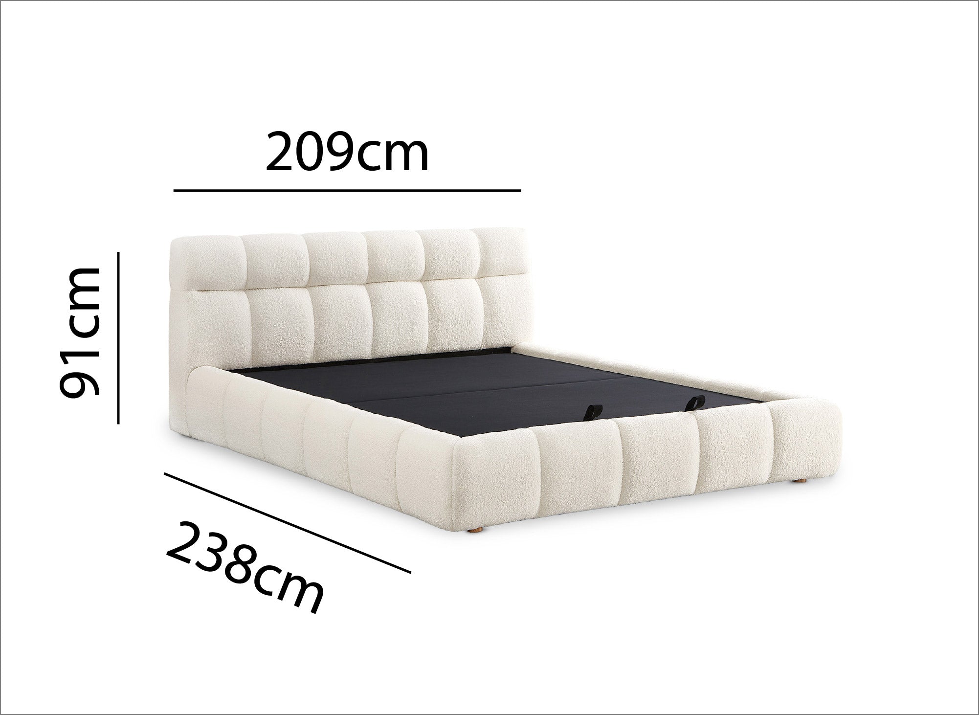 Die weiche Bouclé-Stoffpolsterung in einem schicken Ecru-Ton verleiht jeder Inneneinrichtung einen Hauch von Raffinesse, während das gepolsterte Kopfteil eine warme und gemütliche Atmosphäre schafft.