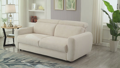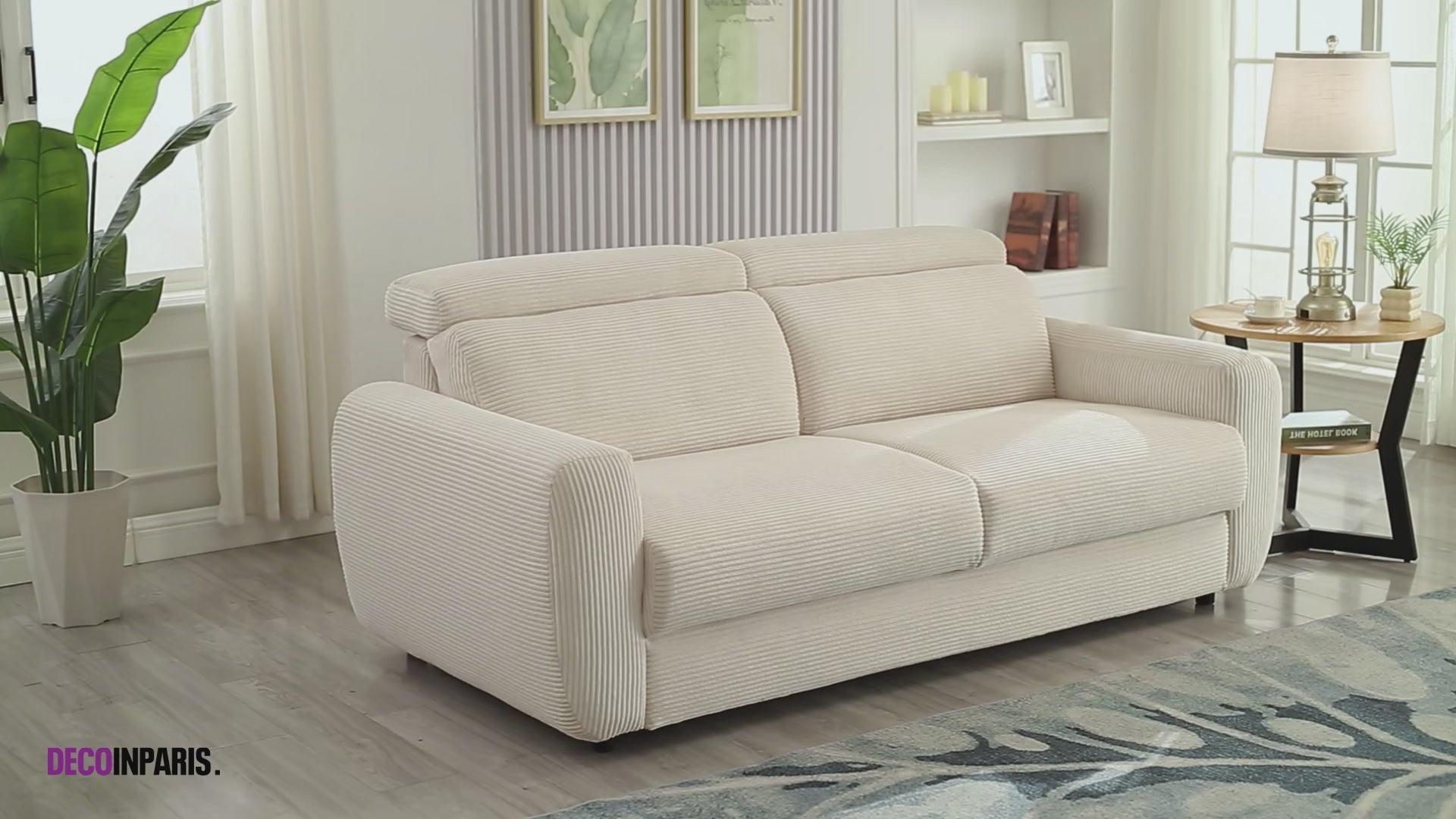 Seine weiche und warme Cordpolsterung in Beige sorgt für ein gemütliches Gefühl und fügt sich perfekt in moderne oder klassischere Einrichtungen ein. Die verstellbaren Kopfstützen bieten optimale Unterstützung für Kopf und Nacken, egal ob beim Lesen, Fernsehen oder einfach beim Entspannen.