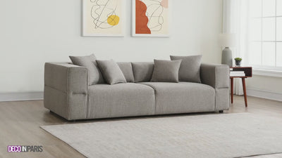 Das 3-Sitzer-Sofa EVELYNE aus taupefarbenem Stoff ist eine Kombination aus Komfort und Design und perfekt für Ihr Wohnzimmer!