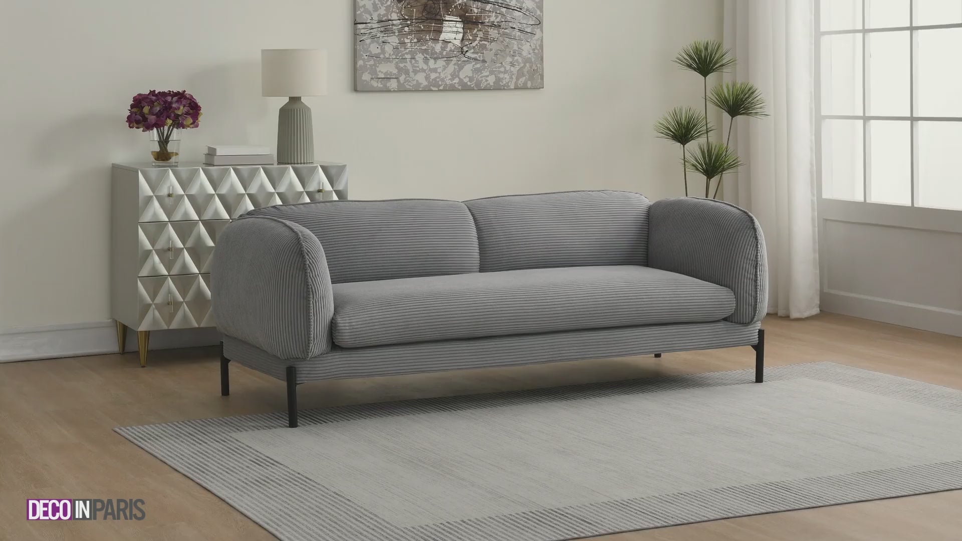 Entdecken Sie unser 3-Sitzer-Sofa ANDREA aus grauem geripptem Samt: die perfekte Kombination aus modernem Design und Vintage-Charme!