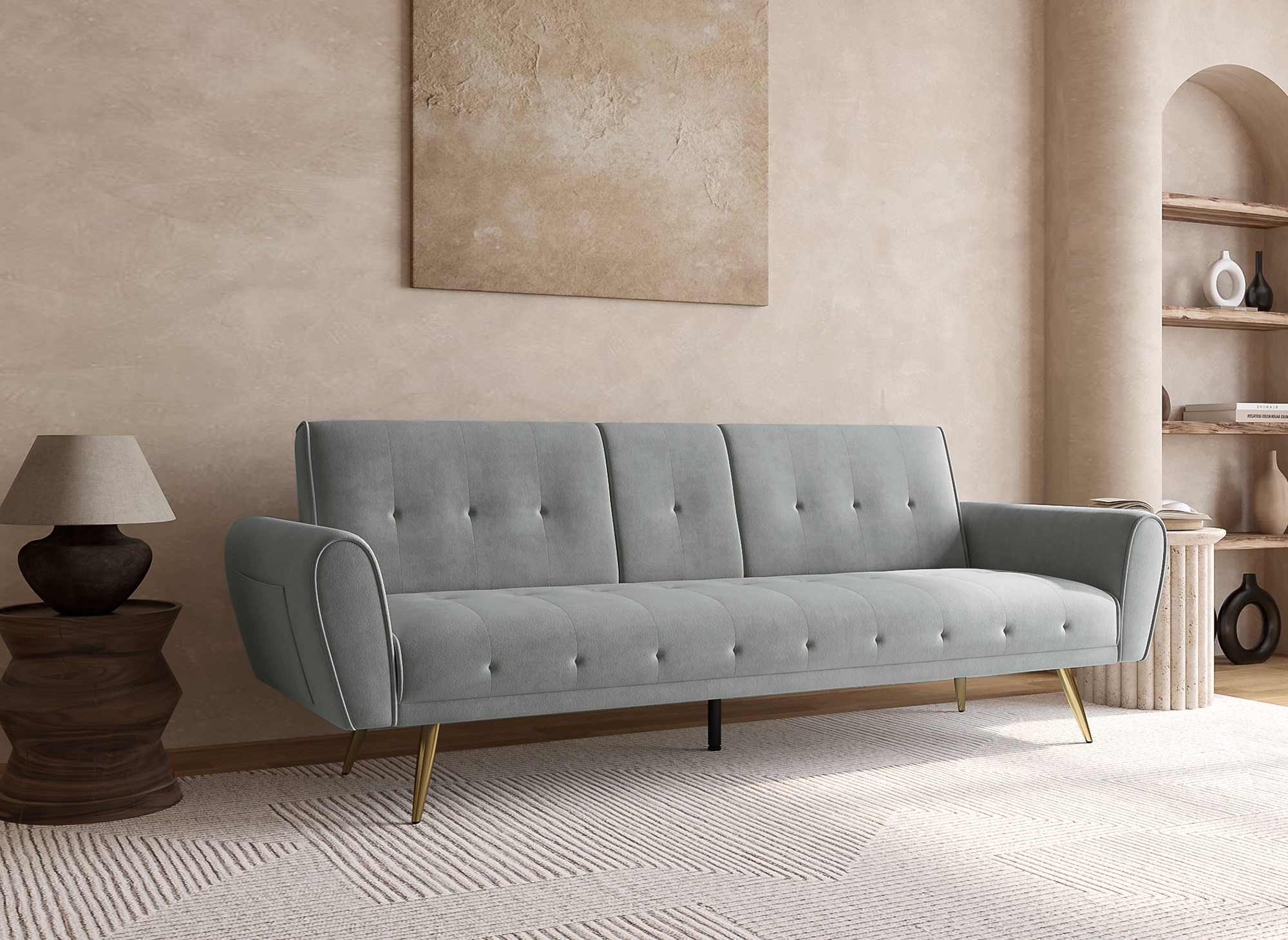 Verleihen Sie Ihrem Interieur mit unserem hellgrauen Samtschlafsofa LIMA einen Hauch von Weichheit und Design!