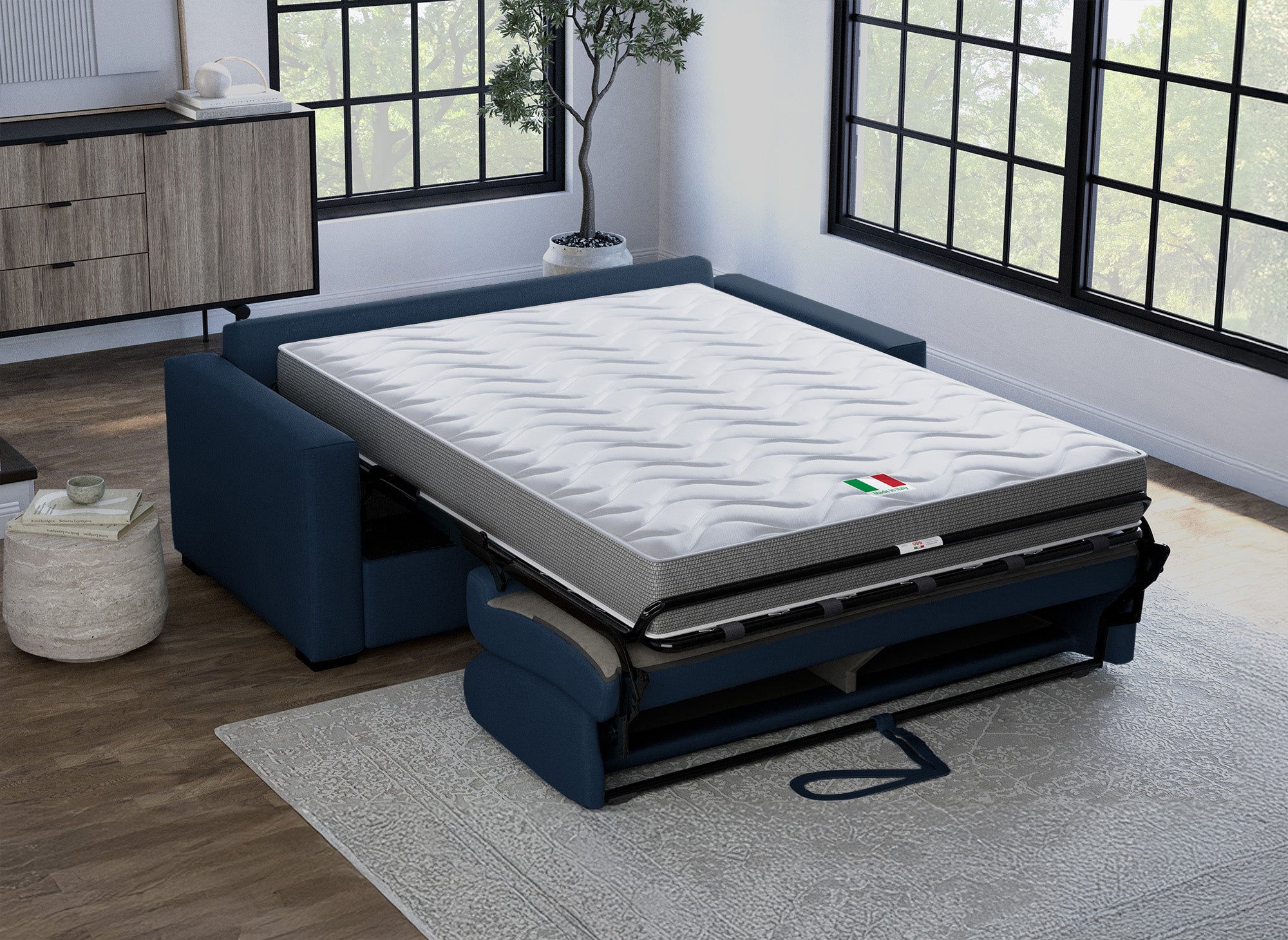 LOUNA LUXE 3-Sitzer-Schlafsofa aus jeansblauem Stoff mit Expressöffnung und 18 cm Matratze