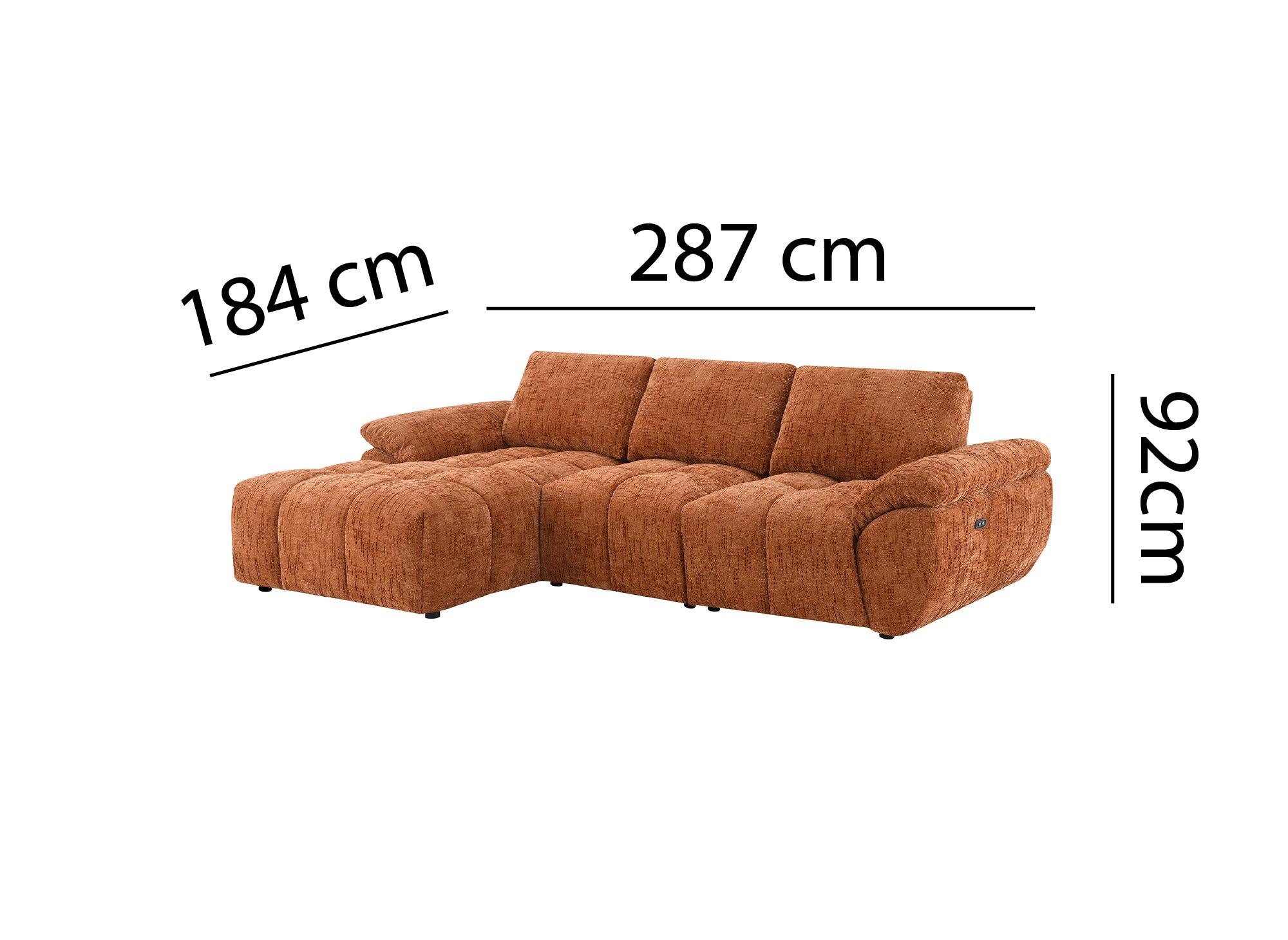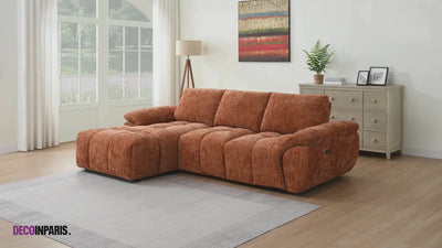 Das elektrisch verstellbare Ecksofa ALPES aus terrakottafarbenem, meliertem Samt vereint auf elegante Weise Komfort und modernes Design. Mit seiner großzügigen Sitzfläche, den abgerundeten Formen und dem strukturierten, melierten Samtbezug verleiht es Ihrem Wohnzimmer eine warme, moderne und raffinierte Note.