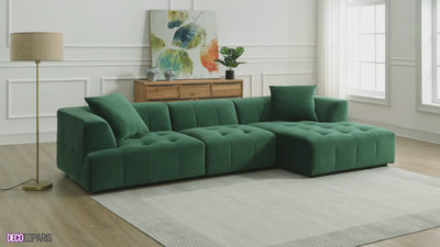Das grüne Samt-Ecksofa KELIA mit nach rechts gerichteter Chaiselongue ist ein modernes Möbelstück, das Ästhetik und Komfort vereint. Mit seinen großzügigen Abmessungen und dem schlichten, eleganten Design eignet sich das Samt-Ecksofa KELIA perfekt für ein geräumiges, modernes Wohnzimmer.
