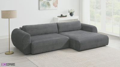 Entdecken Sie das 3-Sitzer-Ecksofa TILDA mit Stauraum aus dickem grauem Cord , ein Herzstück, das Eleganz und Funktionalität vereint und Ihr Interieur aufwertet.