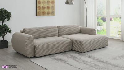 Entdecken Sie das 3-Sitzer-Ecksofa TILDA mit Stauraum aus dickem Taupe-Cord , ein Herzstück, das Eleganz und Funktionalität vereint und Ihr Interieur aufwertet.
