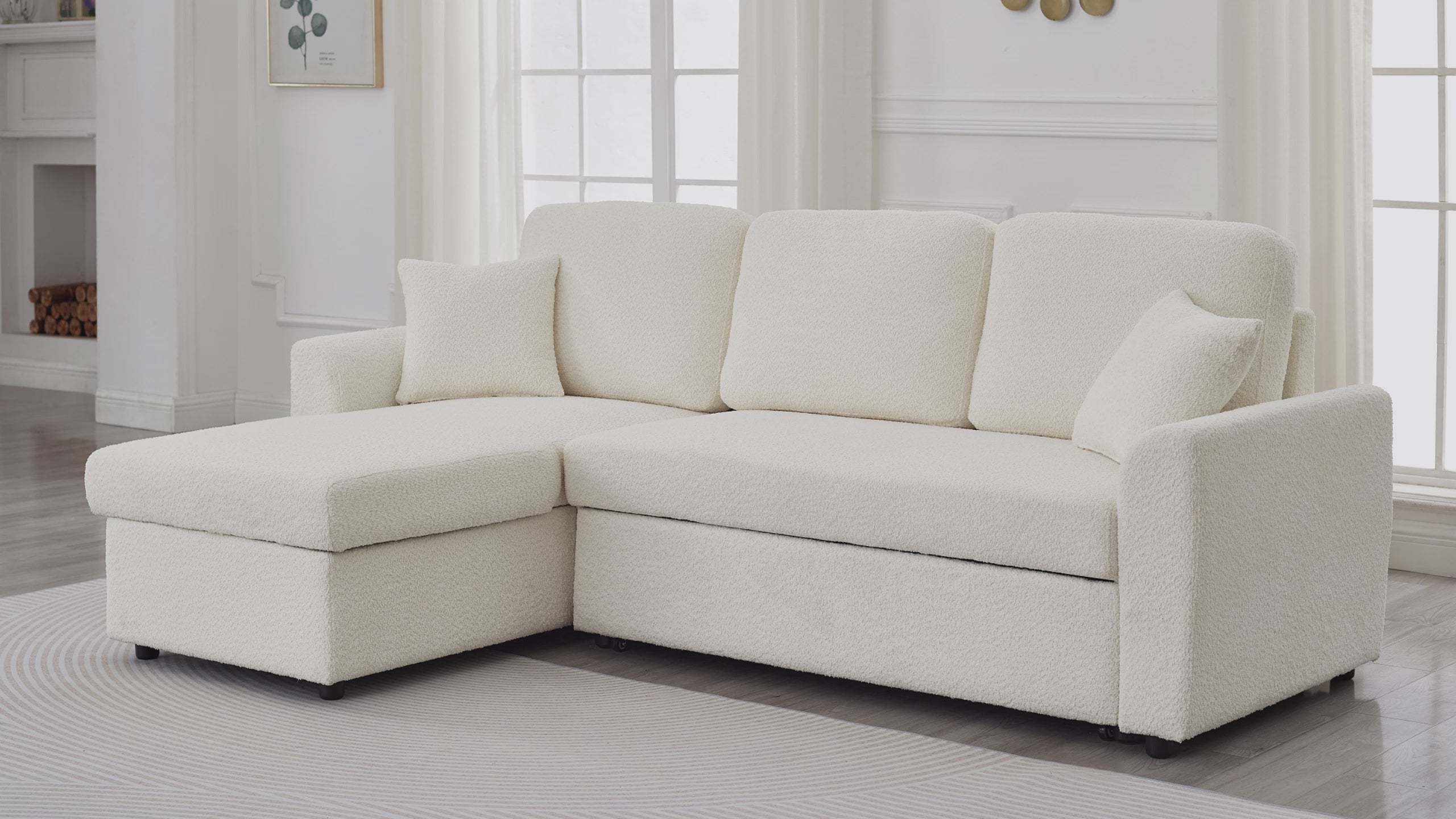 ADRYEN umwandelbares und wendbares Ecksofa mit Stauraum aus beigem Bouclé-Stoff