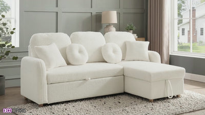 Entdecken Sie das wendbare und umwandelbare Ecksofa GREGORY mit Stauraum aus ecrufarbenem Bouclé-Stoff . Dieses moderne Sofa passt perfekt in alle Arten von Inneneinrichtungen: Vintage, zeitgenössisch oder minimalistisch.