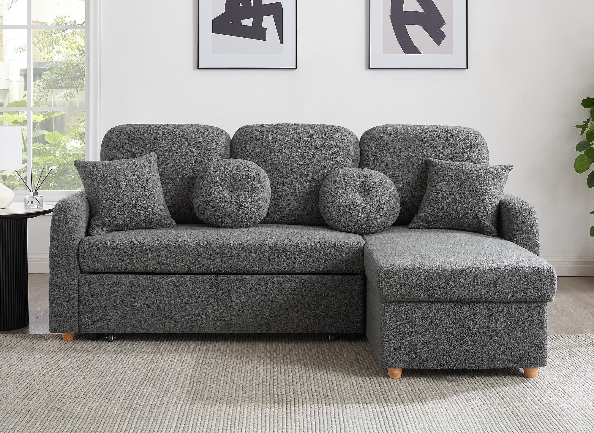 GREGORY umwandelbares und wendbares Ecksofa mit Stauraum aus dunkelgrauem Bouclé-Stoff