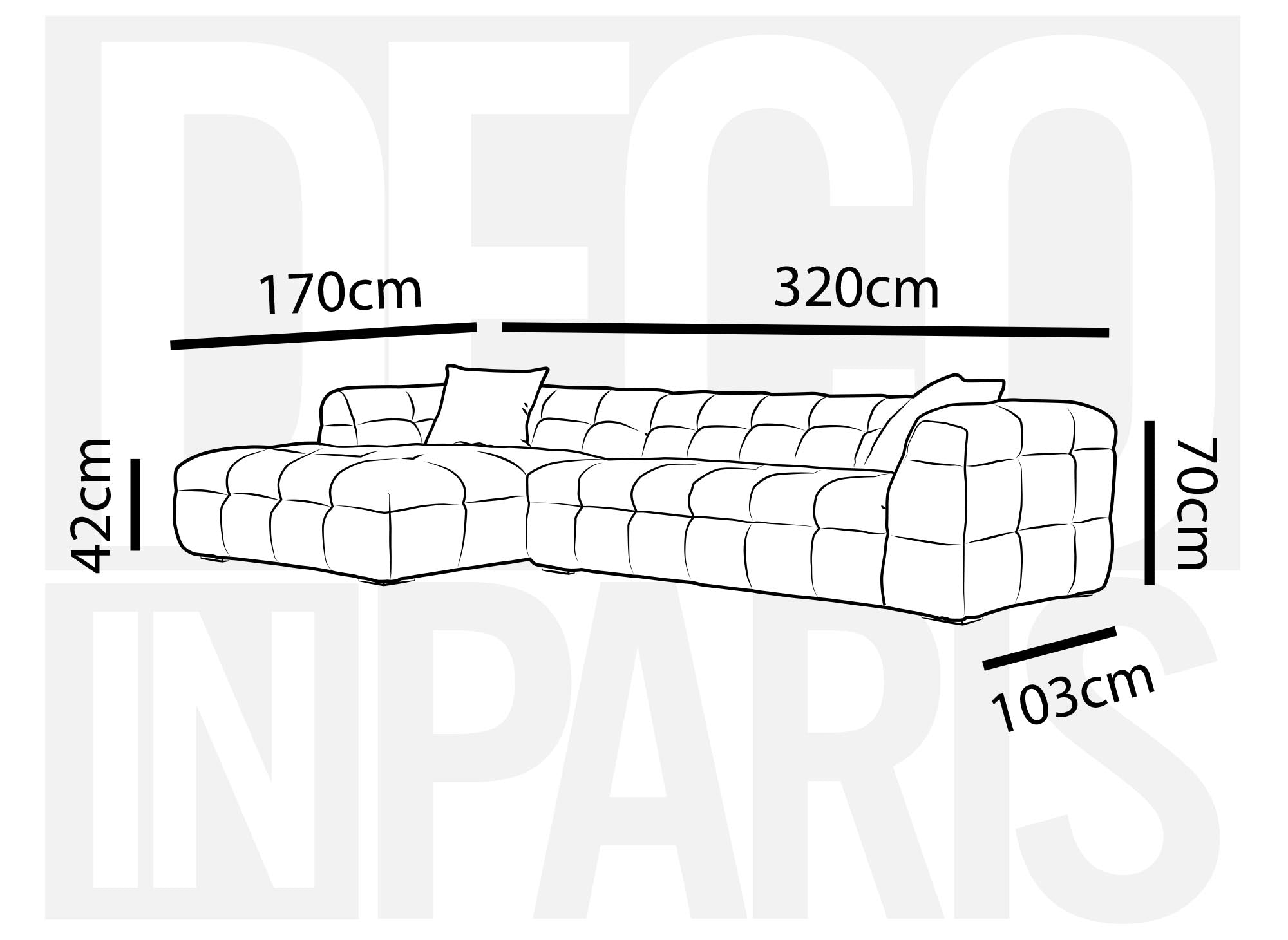 Maße: Breite: 320 cm x Länge 170 cm x Tiefe 103 cm x Höhe 70 cm / Sitzhöhe: 42 cm / Beinhöhe: 3 cm