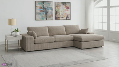 Entdecken Sie das wendbare Ecksofa SIRINA mit weicher Rippung in Taupe , ideal, um Ihrem Wohnzimmer einen Hauch von Modernität und Eleganz zu verleihen. Seine raffinierte Ästhetik und die Cordpolsterung fügen sich harmonisch in alle Einrichtungsstile ein, ob Designer, klassisch oder modern.
