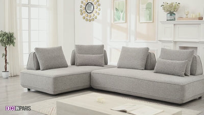 Verleihen Sie Ihrem Wohnzimmer mit dem wendbaren Ecksofa ISAORA aus grauem Bouclette-Stoff einen Hauch von Weichheit und Eleganz.