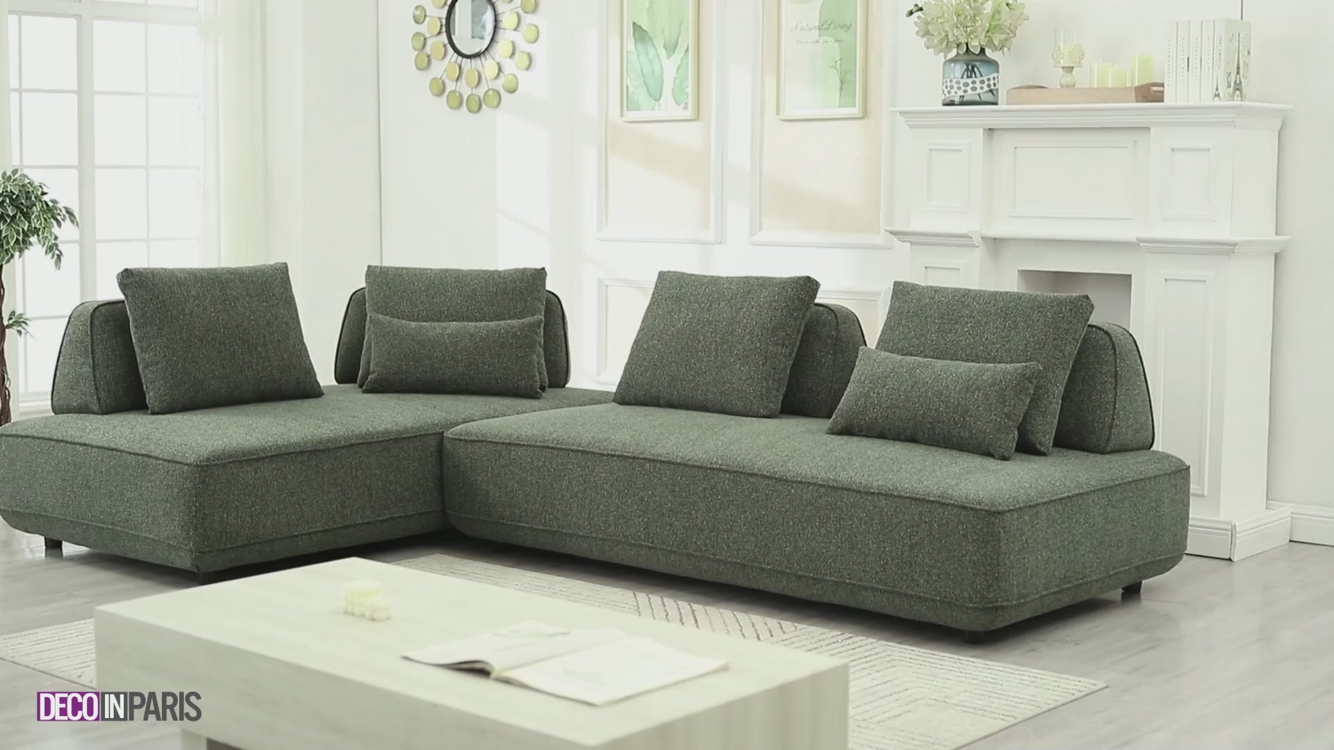 Bringen Sie mit dem wendbaren Ecksofa ISAORA aus khakigrün meliertem Stoff einen Hauch von Weichheit und Eleganz in Ihr Wohnzimmer.