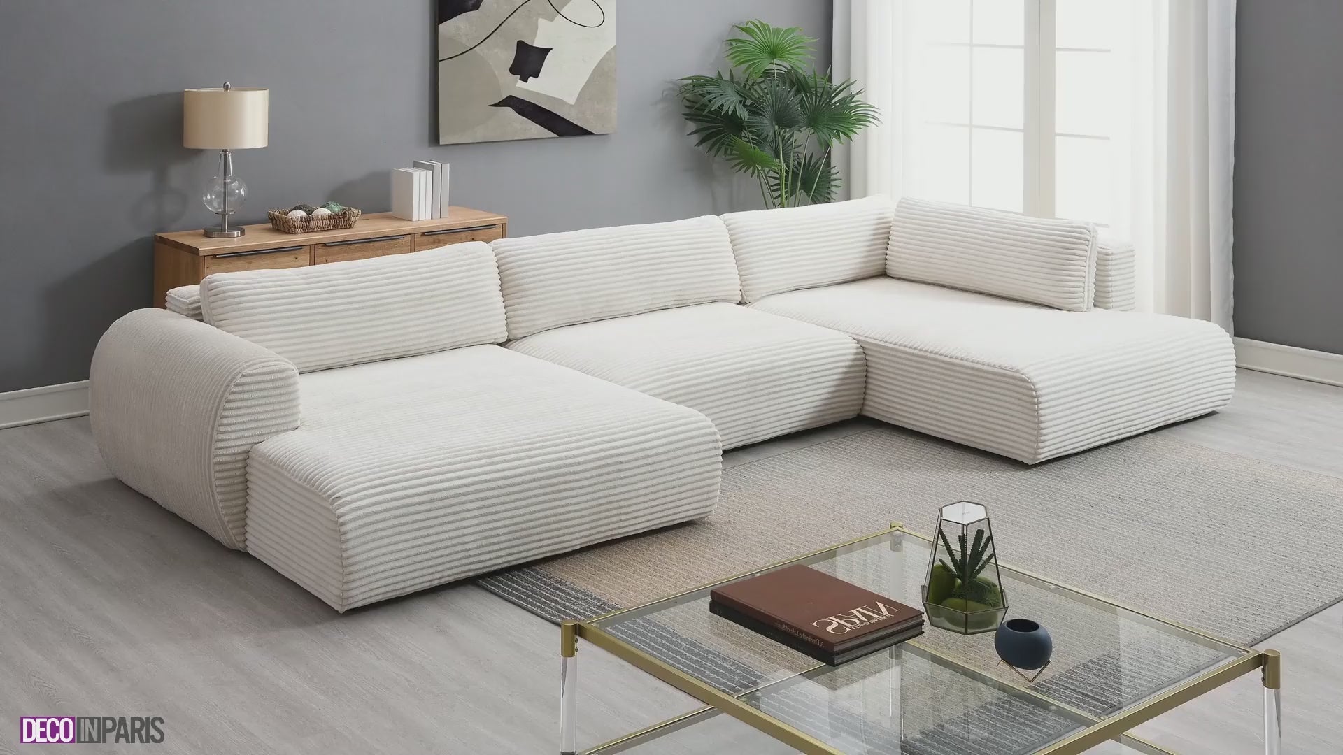 Möchten Sie Ihrem Zuhause eine gemütliche und zugleich elegante Atmosphäre verleihen? Dann entscheiden Sie sich für das rechteckige Panoramasofa TILDA aus beigefarbenem Cord mit Aufbewahrungsbox.