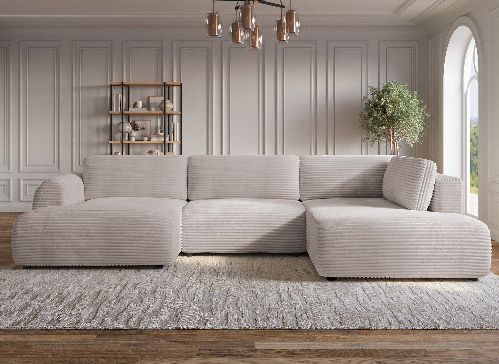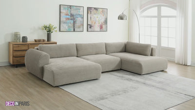 Das umwandelbare Panoramasofa TILDA aus Taupe-Cord ist die perfekte Lösung für die Schaffung eines gemütlichen und eleganten Interieurs, das Komfort, Stil und Funktionalität vereint.
