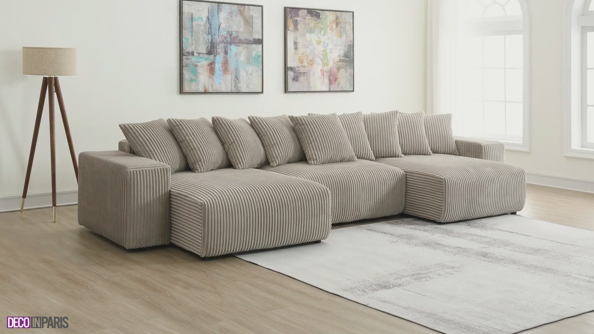 Entdecken Sie unser umwandelbares Panoramasofa NOELIA mit Aufbewahrungsbox aus dickem Taupe-Cord.