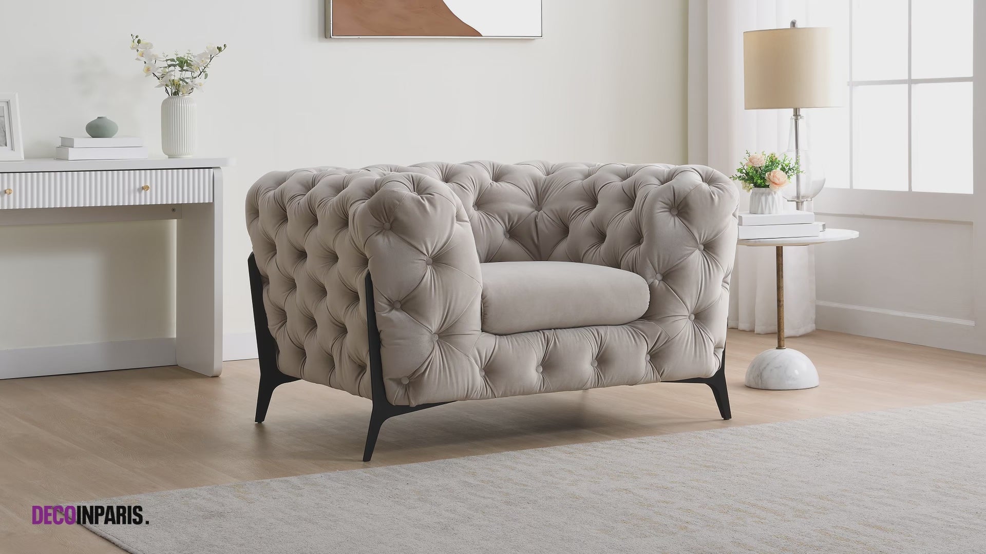 Der beigefarbene Chesterfield-Sessel CARMEN aus Samt verleiht Ihrem Wohnzimmer mit seinem gemütlichen und eleganten Look einen atemberaubenden Touch. Er weist alle Merkmale eines traditionellen Chesterfield-Sessels auf, neu interpretiert mit modernen Accessoires wie den schwarzen Metallbeinen, die sich um das Sofa schmiegen.