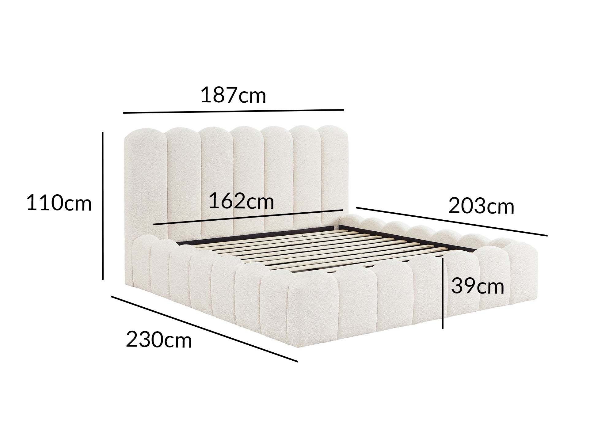 Das Bett RITA aus beigem Frottee passt problemlos zu verschiedenen Möbelstilen und ist für Räume mit Standardgröße geeignet. Seine robuste Struktur garantiert einen dauerhaften täglichen Gebrauch.