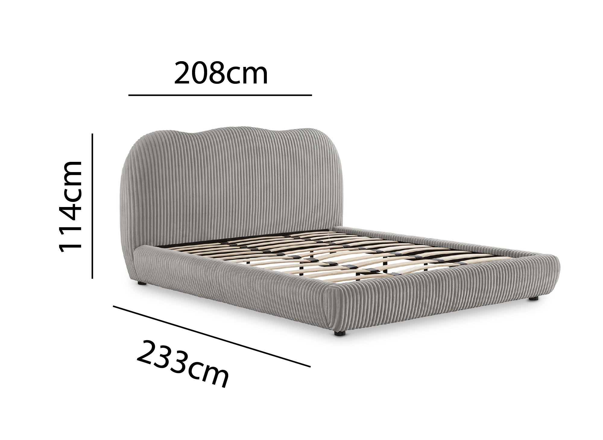 Eleganz und Komfort vereinen sich perfekt im 180 x 200 cm großen Doppelbett SARA aus dickem grauem Cord , ideal, um Ihrem Schlafzimmer einen Hauch von Weichheit zu verleihen. Seine abgerundete Form und das dezent gewellte Kopfteil verleihen Ihrem Schlafbereich zeitlosen Charme.