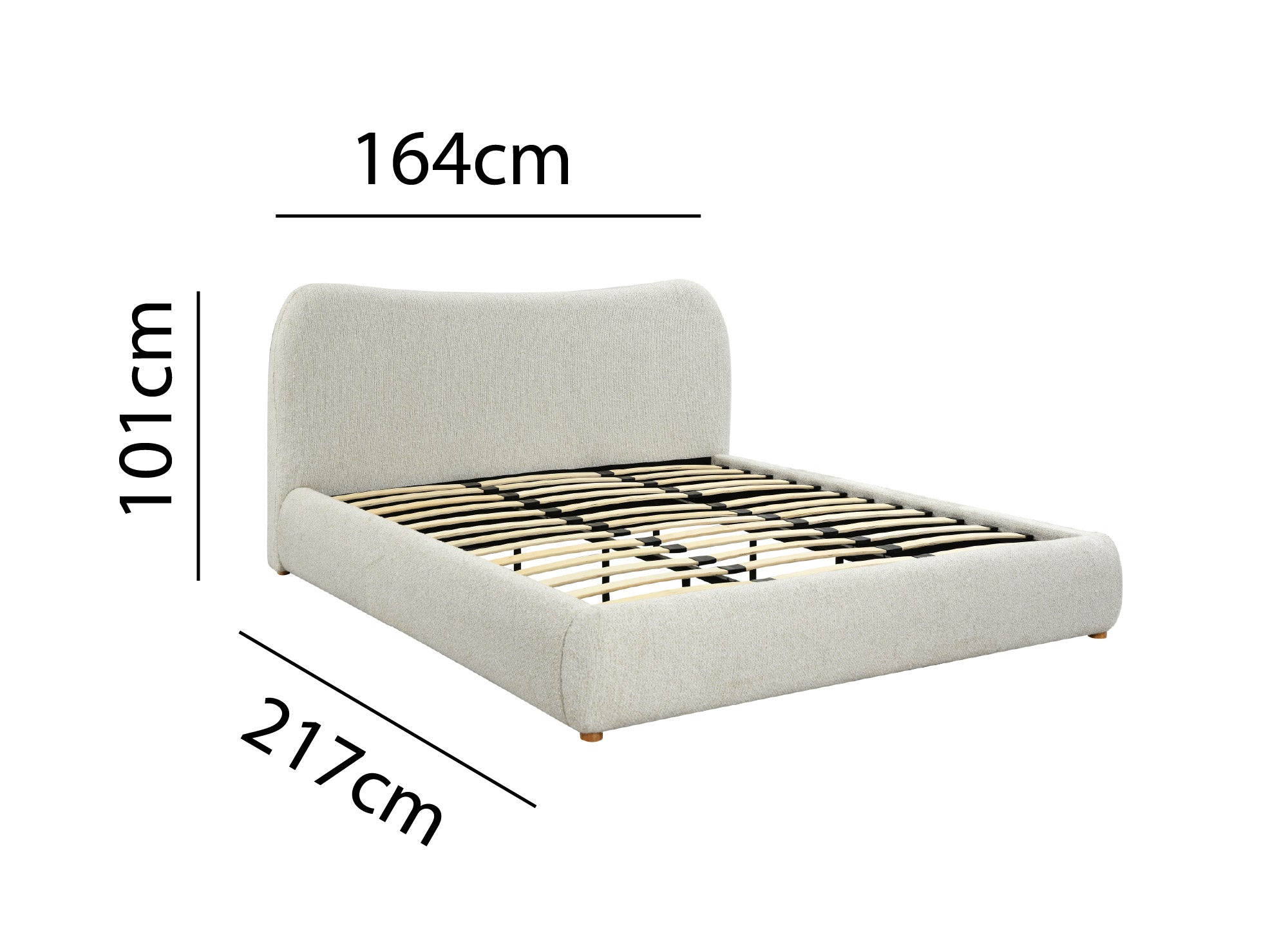 Die cremefarbene Farbe lädt zum Entspannen und Erholen ein und sorgt für warme und erholsame Nächte. Das einzigartig geformte Kopfteil greift den eleganten Stil des Bettes auf. Der Stoff in Schaffelloptik schafft einen gemütlichen, eleganten Raum, der sich perfekt in Ihre Inneneinrichtung einfügt.
