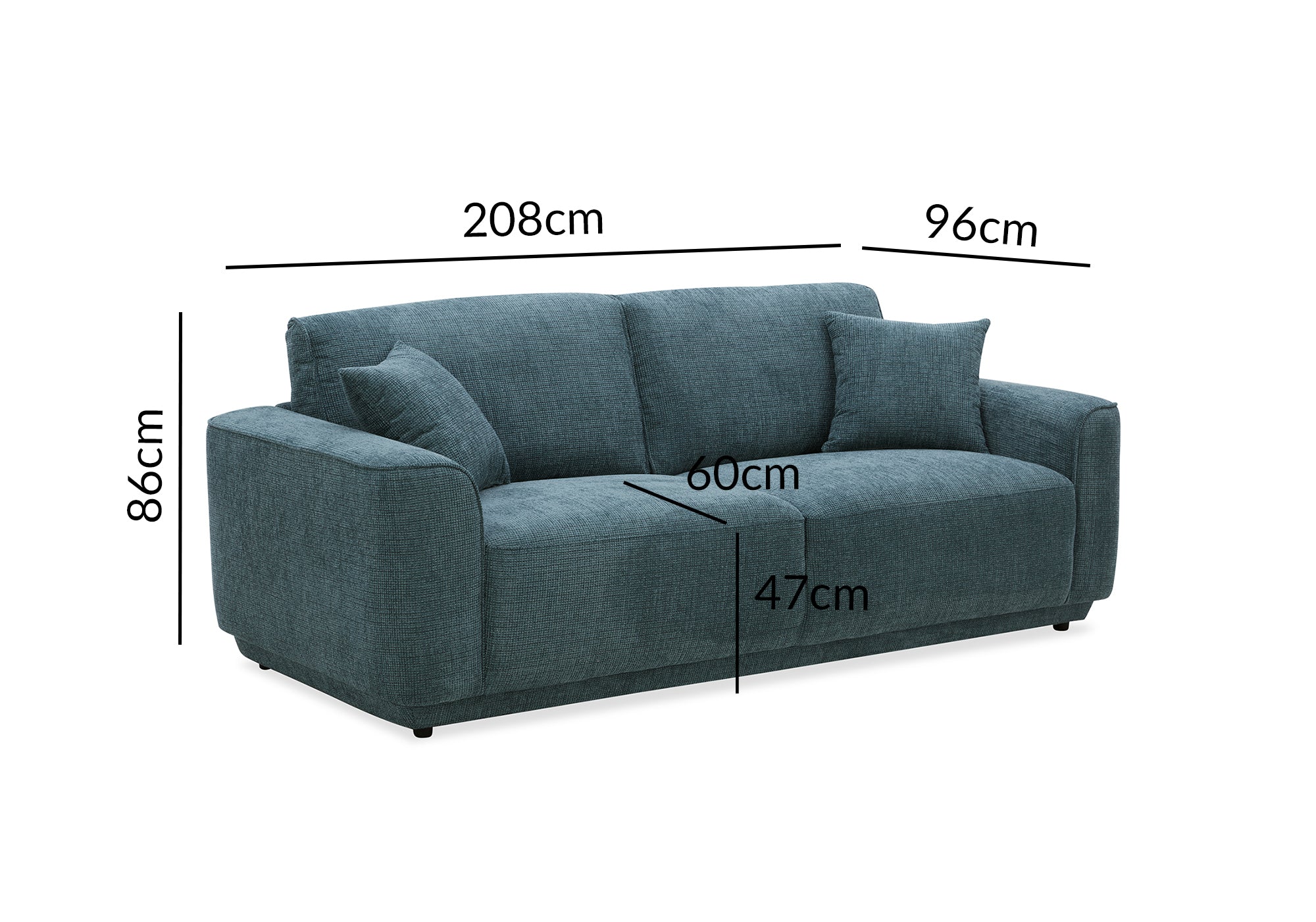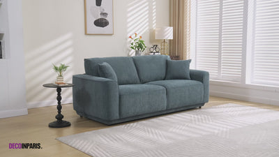 Das dreisitzige, geradlinige Sofa CARLOTA aus meliertem, entenblauem Samt vereint Weichheit, Stil und Komfort und wertet so Ihr Wohnzimmer auf.