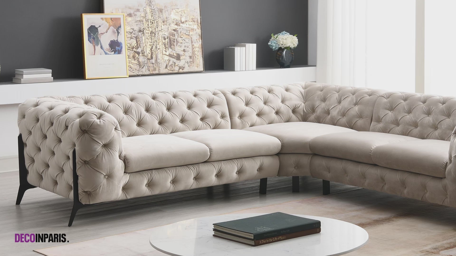 Entdecken Sie unser Ecksofa CARMEN aus beigem Samt und die perfekte Kombination aus legendärem und zeitlosem britischen Stil!