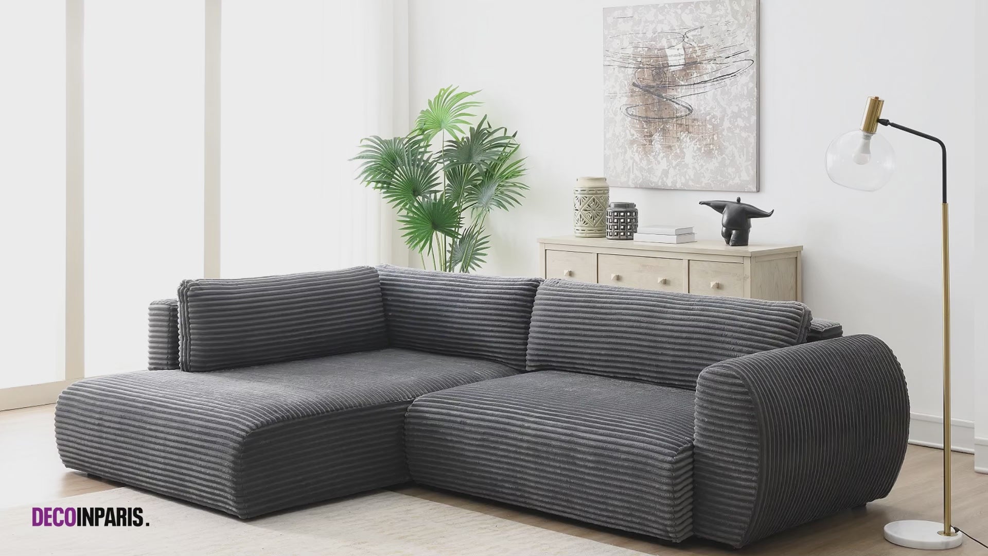 Möchten Sie Ihrem Zuhause eine gemütliche und zugleich elegante Atmosphäre verleihen? Verlieben Sie sich in das umbaubare Ecksofa TILDA mit Chaiselongue aus dickem grauem Cord.