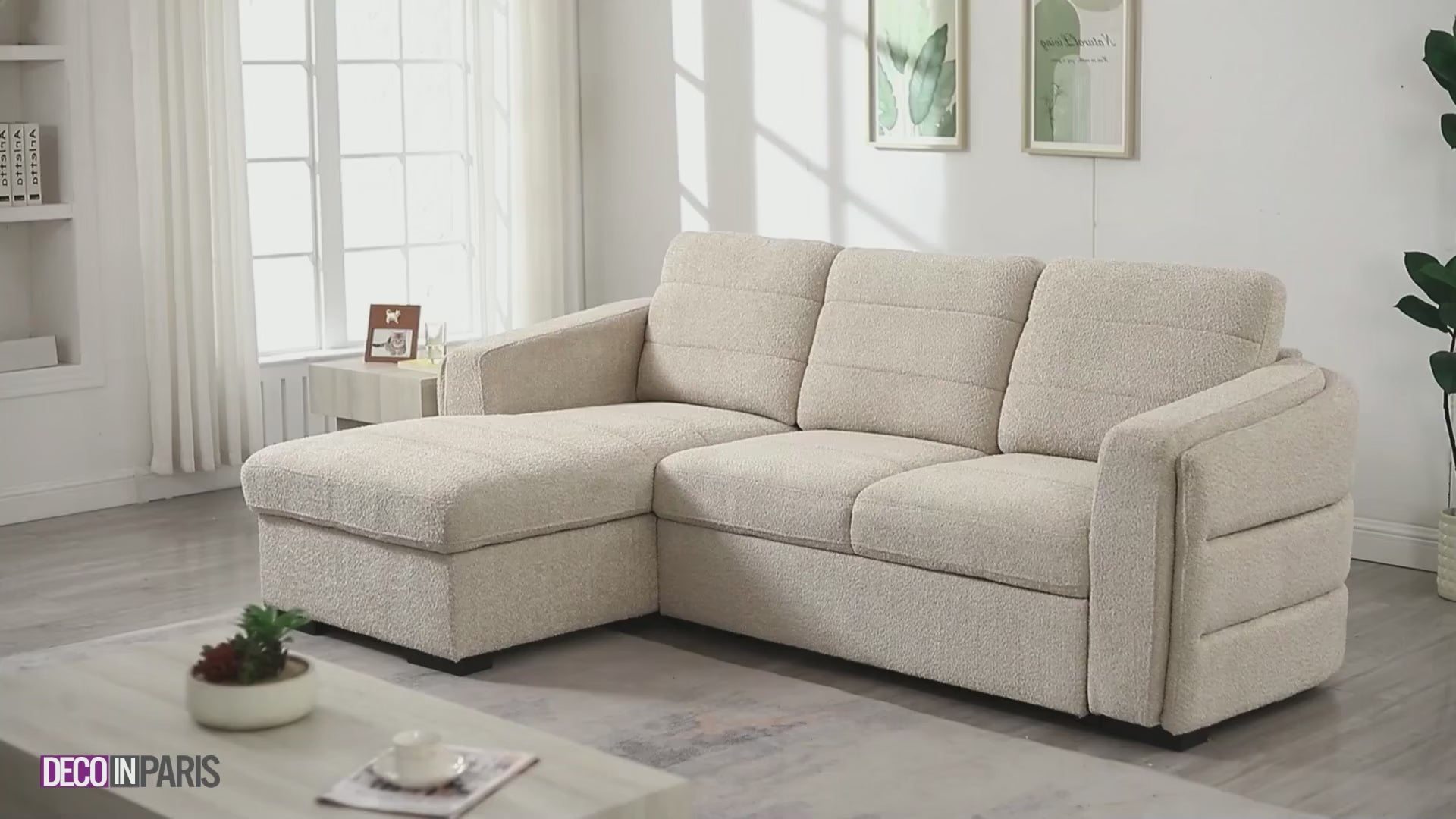 Das Schlafsofa CALANDRA aus beigem Bouclé-Stoff ist die ideale Lösung für alle, die Stil, Komfort und Funktionalität vereinen möchten. Fügen Sie ein paar Kissen oder eine Decke hinzu, um einen gemütlichen und persönlichen Effekt zu erzielen!