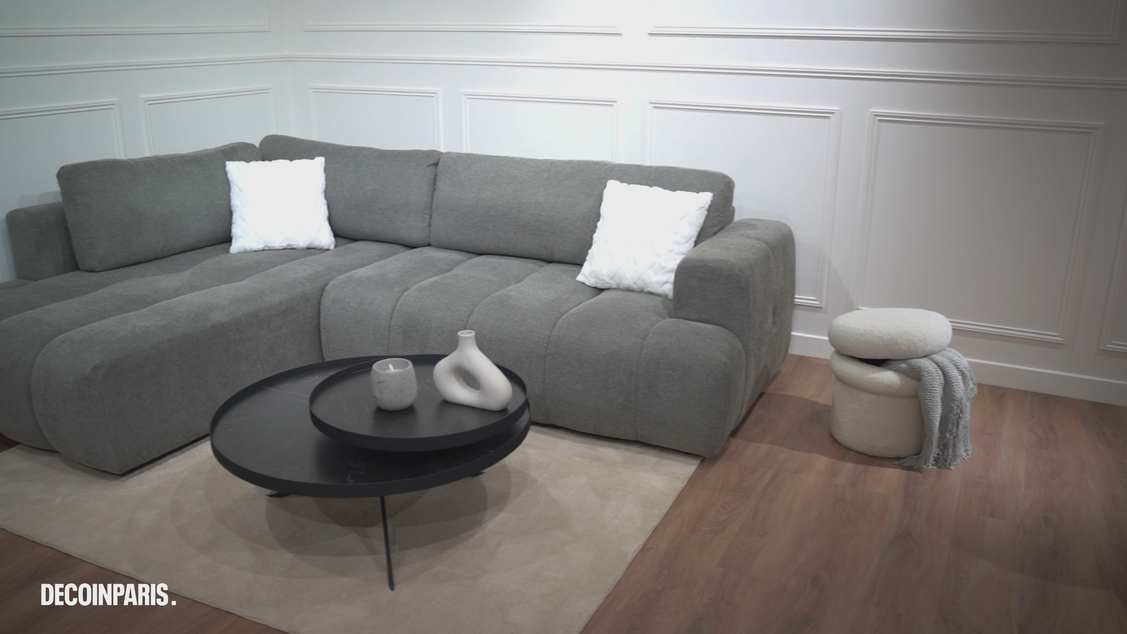 Sein weicher, strapazierfähiger und trendiger Stoffbezug sorgt für eine warme und edle Textur, während sein neutraler Farbton sich harmonisch in alle Dekorationsstile einfügt, sei es für ein großes Wohnzimmer oder einen intimeren Raum.