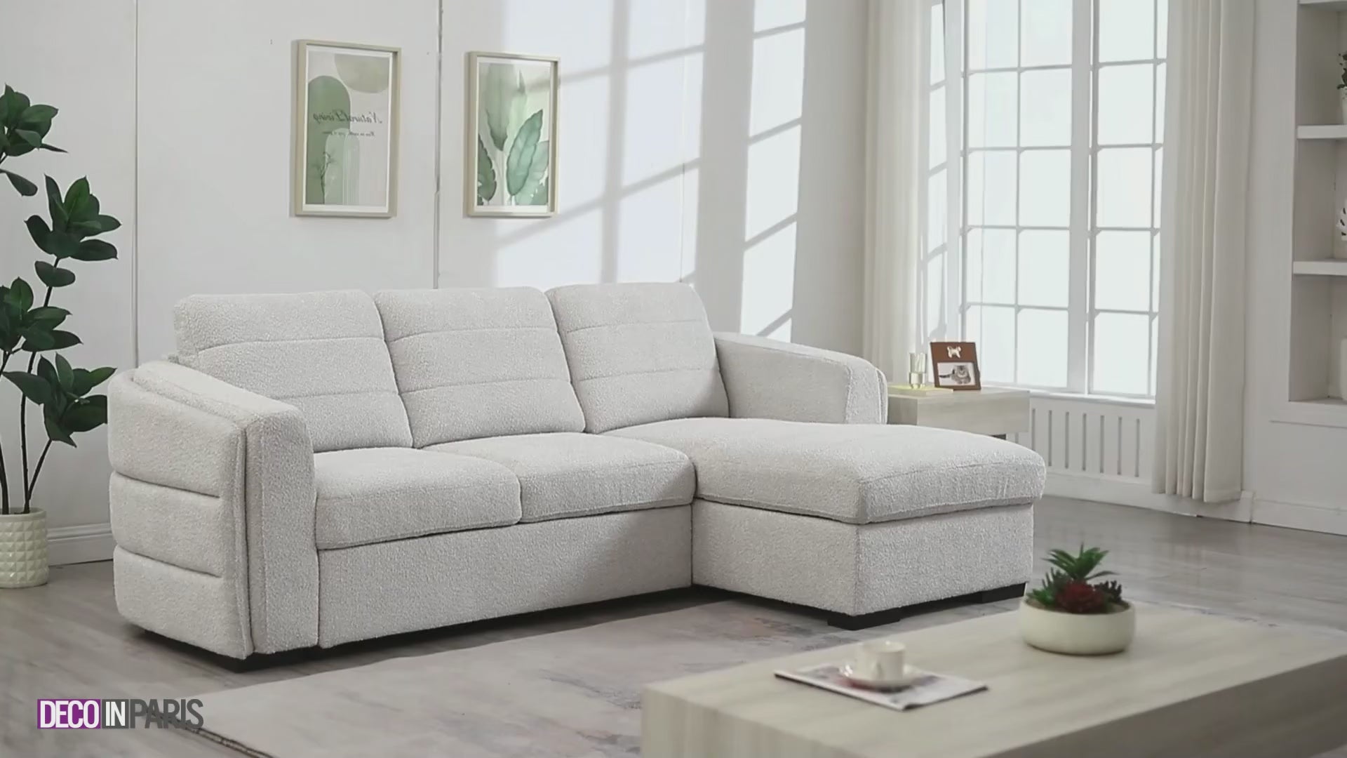 Verwandeln Sie Ihr Wohnzimmer mit dem umwandelbaren Ecksofa CALANDRA, das modernes Design, Komfort und Funktionalität perfekt vereint. Mit seinem weichen und eleganten hellgrauen Bouclé-Stoffbezug verleiht dieses Sofa Ihrem Wohnraum eine warme und moderne Note.