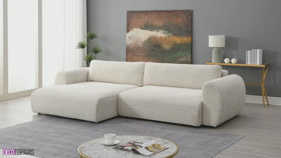 Entdecken Sie das 3-Sitzer-Ecksofa TILDA mit Stauraum aus dickem, beigem Cord , ein Herzstück, das Eleganz und Funktionalität vereint und Ihr Interieur aufwertet.