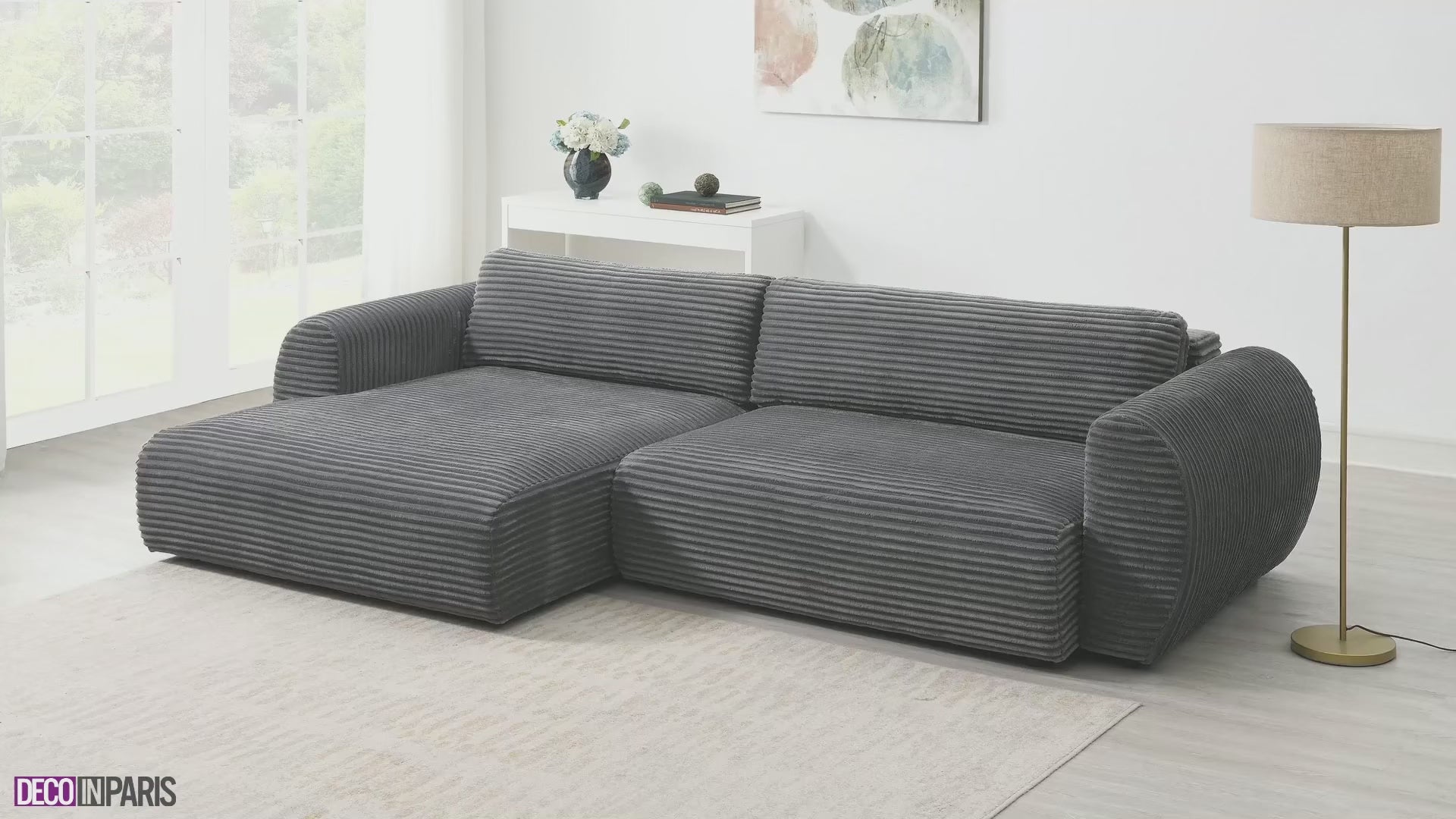 Entdecken Sie das 3-Sitzer-Ecksofa TILDA mit Stauraum aus dickem grauem Cord , ein Herzstück, das Eleganz und Funktionalität vereint und Ihr Interieur aufwertet.