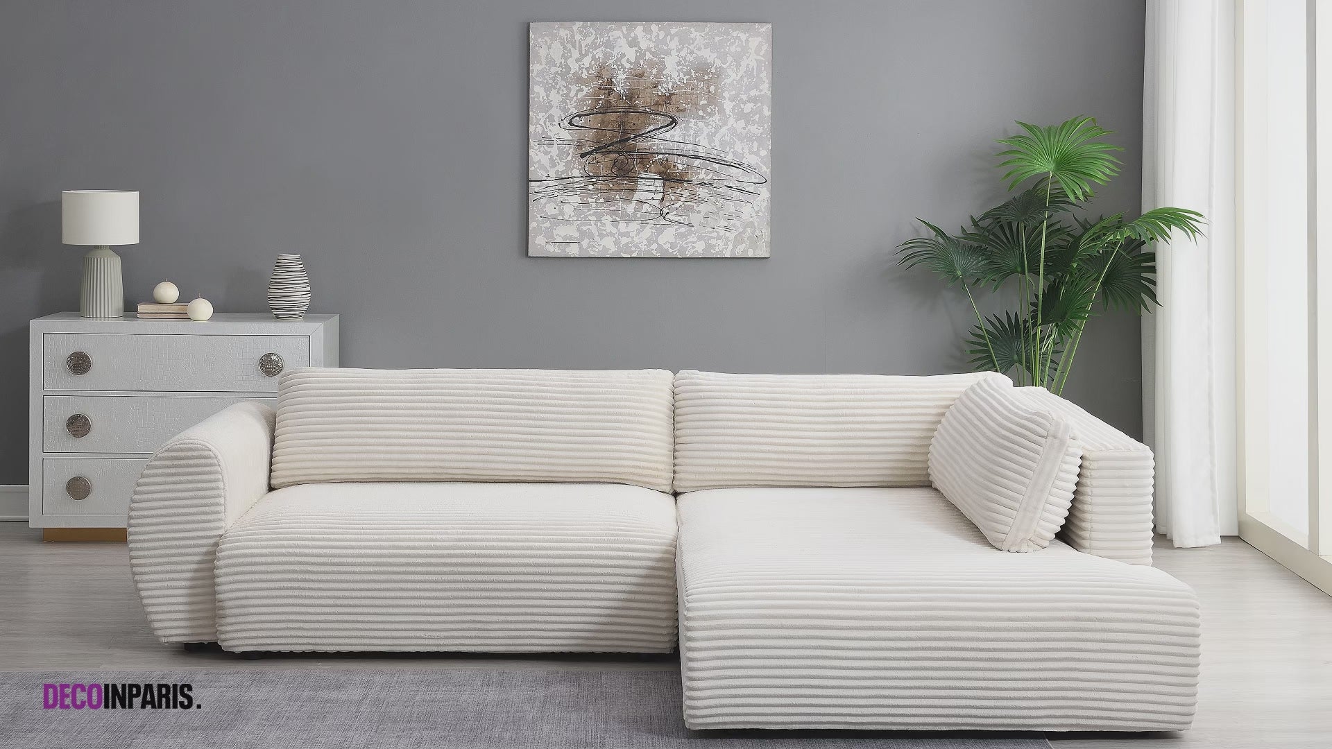 Möchten Sie Ihrem Zuhause eine gemütliche und zugleich elegante Atmosphäre verleihen? Verlieben Sie sich in das beigefarbene Cord-Ecksofa mit Chaiselongue TILDA.