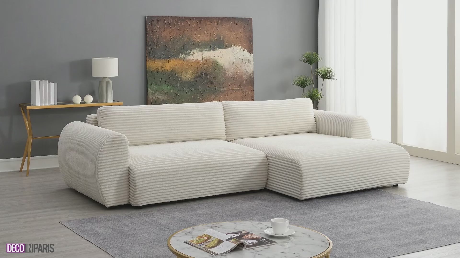Entdecken Sie das 3-Sitzer-Ecksofa TILDA mit Stauraum aus dickem, beigem Cord , ein Herzstück, das Eleganz und Funktionalität vereint und Ihr Interieur aufwertet.
