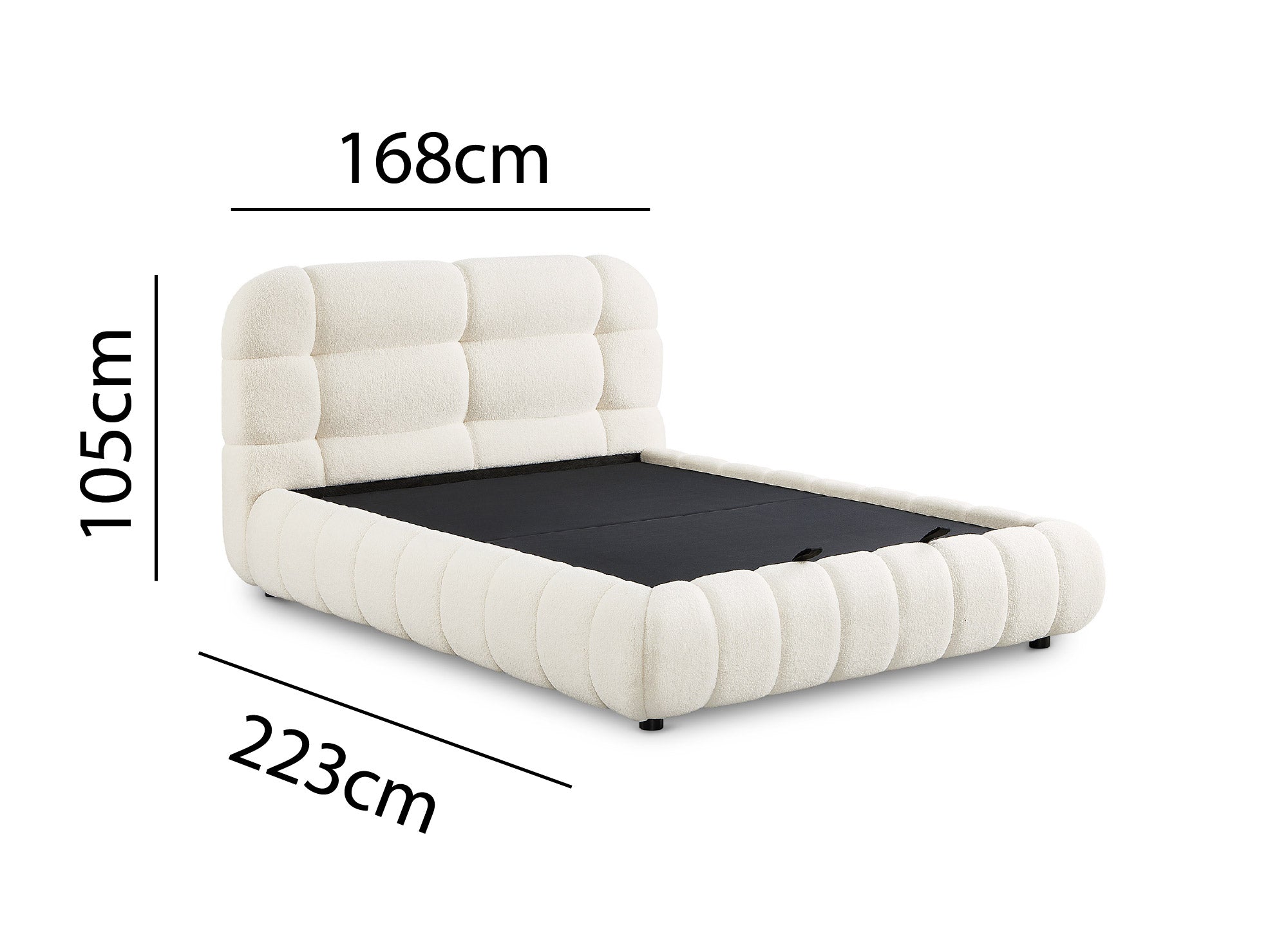 Entscheiden Sie sich für die natürliche Eleganz und Funktionalität des Stauraumbetts YOURI aus ecrufarbenem Bouclé-Stoff und verwandeln Sie Ihr Schlafzimmer in einen wahren Kokon aus Komfort und Stil.