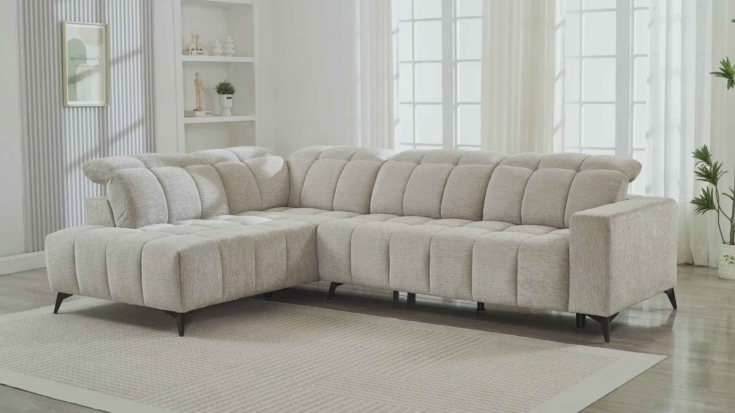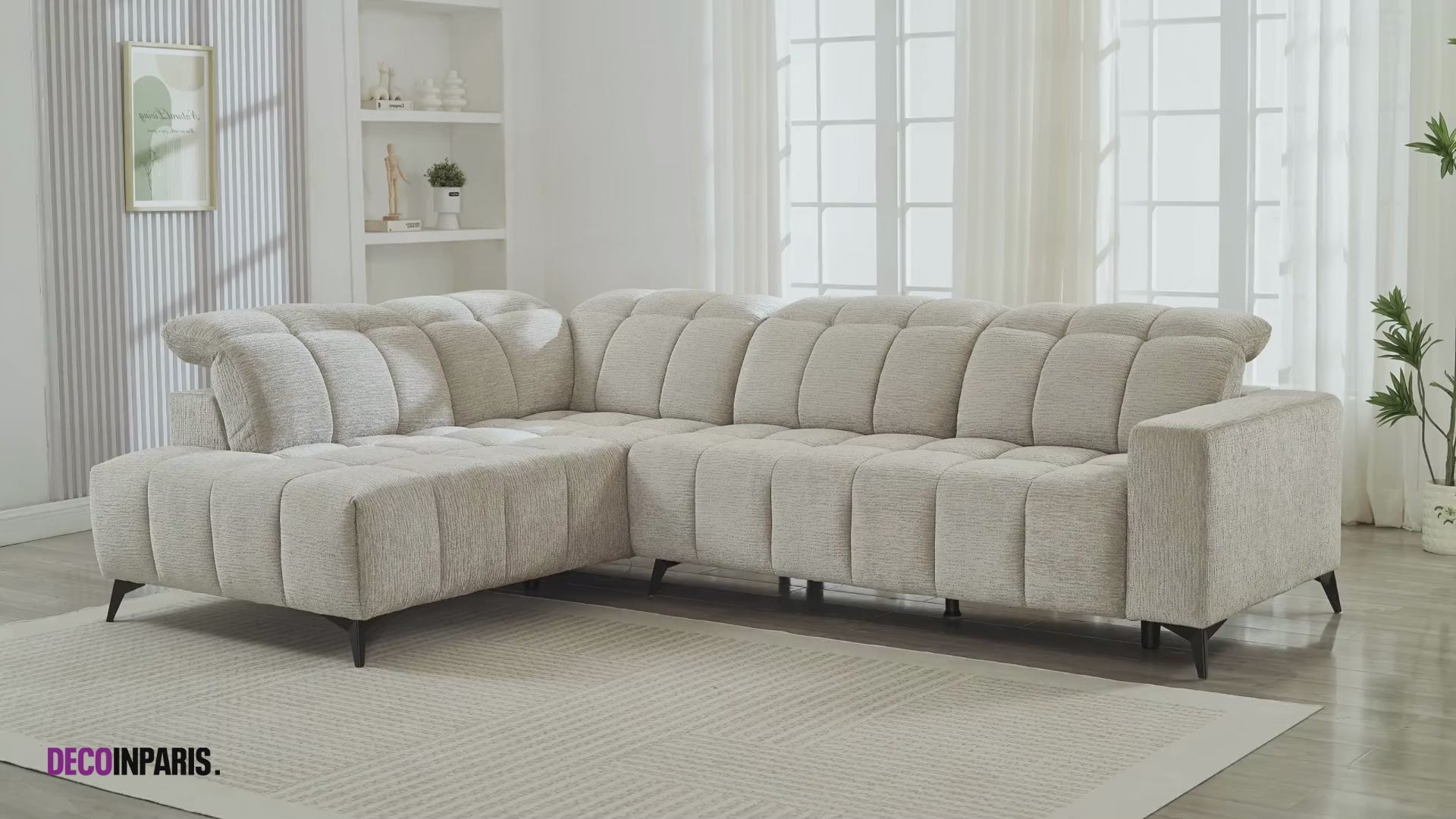 Das Ecksofa ALVAR aus beige meliertem Samt wurde entwickelt, um zeitgenössisches Design und alltägliches Wohlbefinden zu verbinden und verwandelt Ihr Wohnzimmer in eine wahre Oase des Komforts.