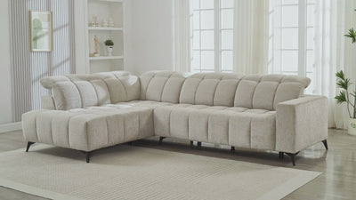 ALVAR elektrisches Relax-Ecksofa aus beige meliertem Samt - Linke Ecke