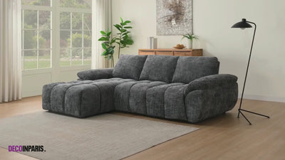 Das elektrisch verstellbare Ecksofa ALPES aus grau meliertem Samt vereint auf elegante Weise Komfort und modernes Design. Mit seiner großzügigen Sitzfläche, den abgerundeten Formen und der strukturierten, melierten Samtpolsterung verleiht es Ihrem Wohnzimmer eine warme, moderne und raffinierte Note.