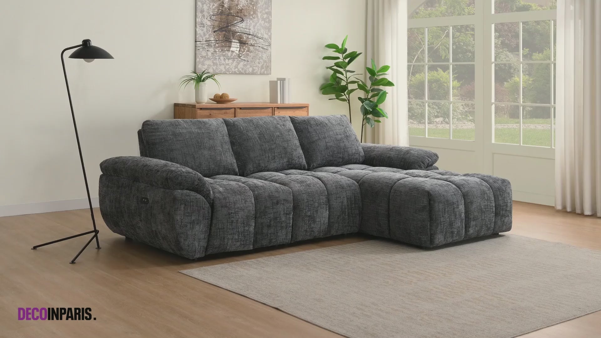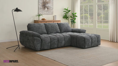 Das elektrisch verstellbare Ecksofa ALPES aus grau meliertem Samt vereint auf elegante Weise Komfort und modernes Design. Mit seiner großzügigen Sitzfläche, den abgerundeten Formen und der strukturierten, melierten Samtpolsterung verleiht es Ihrem Wohnzimmer eine warme, moderne und raffinierte Note.