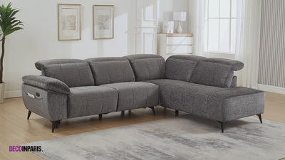 SOLINA Ecksofa mit elektrischer Liegefunktion aus grau meliertem Samt – rechtwinklig