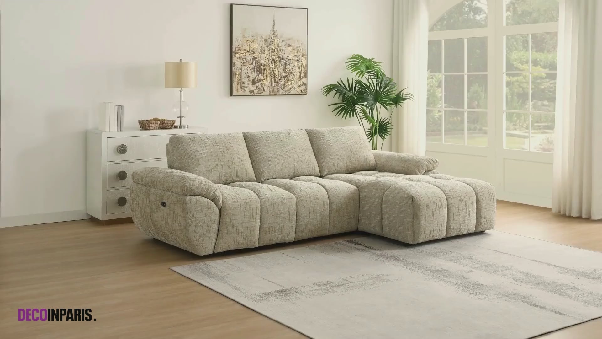 Das elektrisch verstellbare Ecksofa ALPES aus meliertem Samt in Taupe verbindet auf elegante Weise Komfort und modernes Design. Mit seiner großzügigen Sitzfläche, den abgerundeten Formen und der strukturierten, melierten Samtpolsterung verleiht es Ihrem Wohnzimmer eine warme, moderne und raffinierte Note.