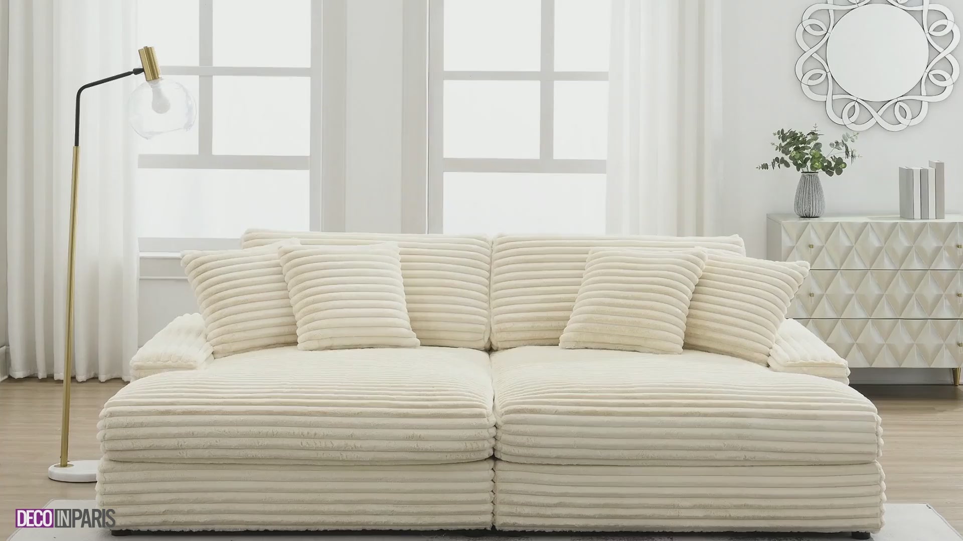 Entdecken Sie das 2-Sitzer-Chaiselongue-Sofa DAHO aus weichem, beigem Rippenstoff , eine ideale Lösung für kleine Räume.