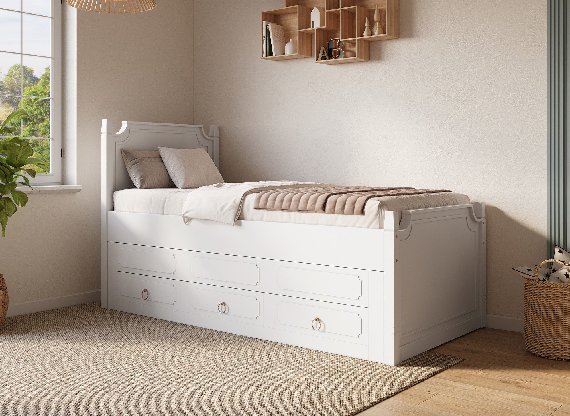 PAULINE weißes Holz-Ausziehbett mit Schubladen 90 x 190 cm