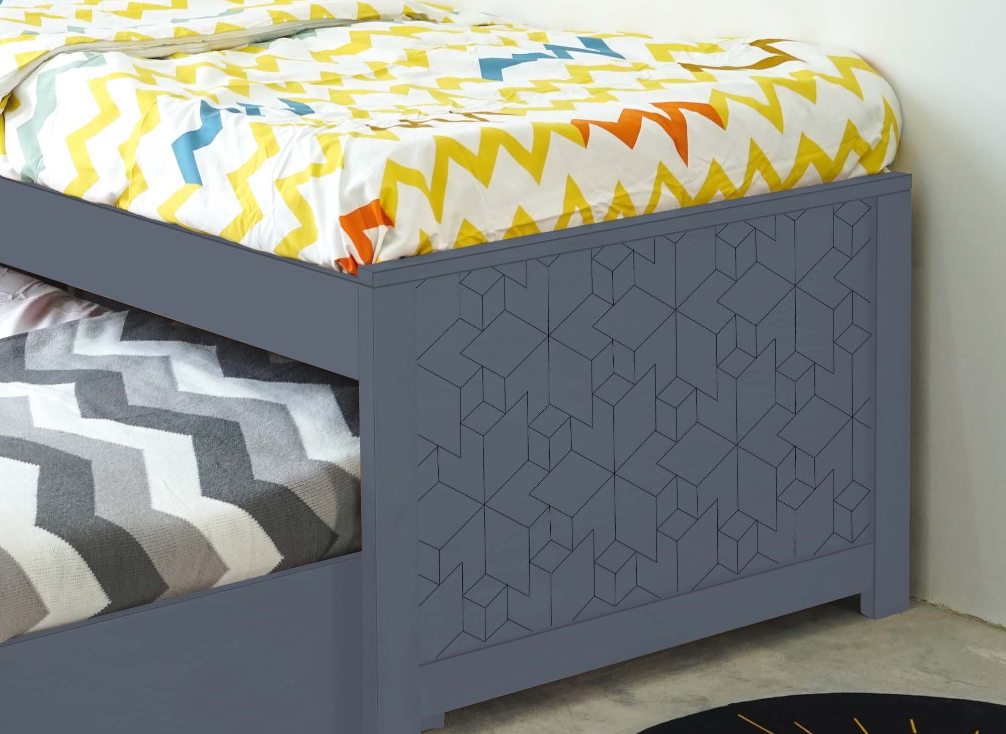 Kompakt, originell und stilvoll – unser Ausziehbett ENORA wird die ganze Familie begeistern. Sein schlichtes, modernes Design mit grafischen Mustern passt zu jedem Einrichtungsstil im Kinder- oder Jugendzimmer.