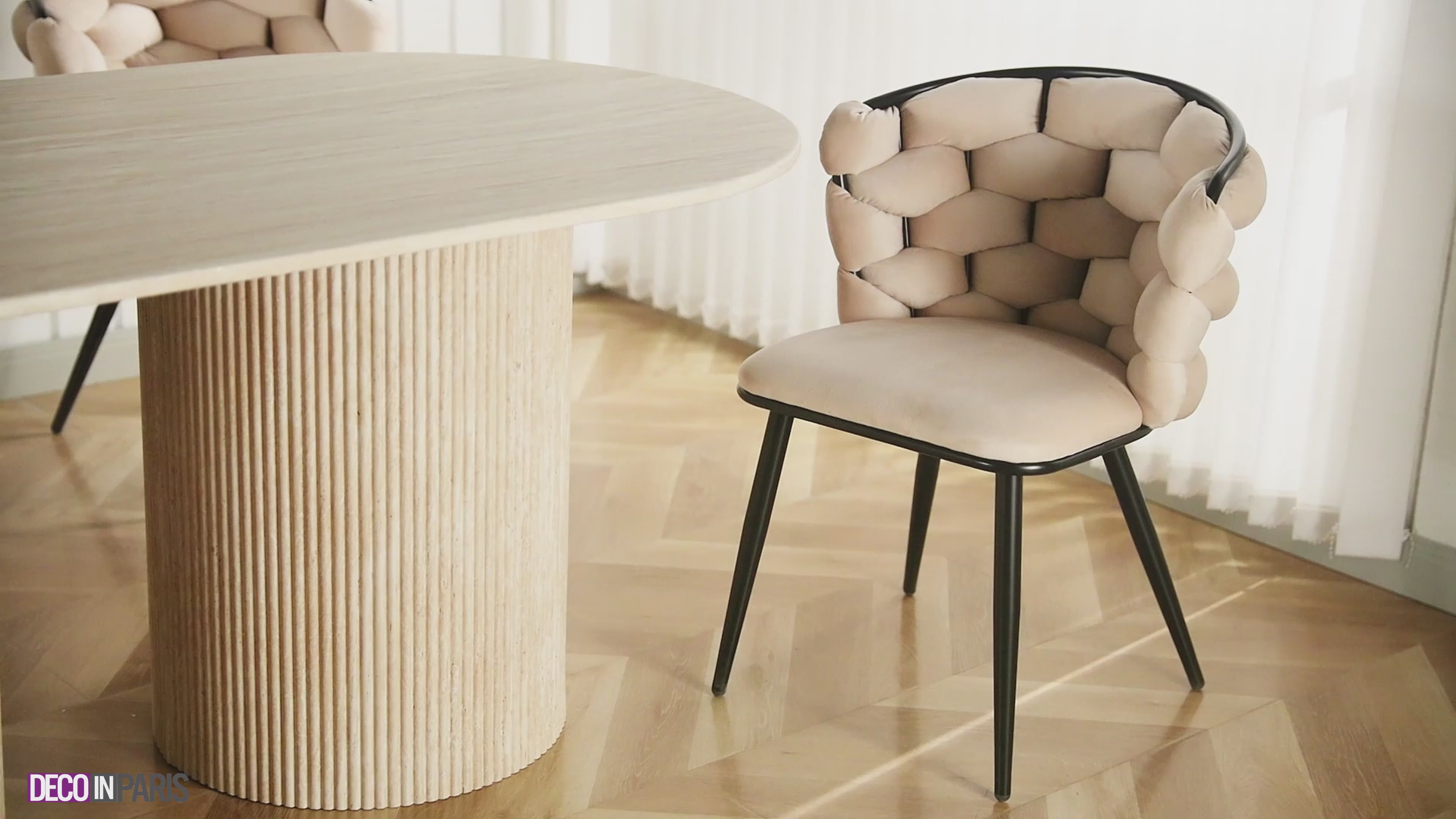 Verwandeln Sie Ihr Esszimmer oder Ihren Entspannungsbereich in einen gemütlichen und trendigen Ort mit unserem 2er-Set CECILE-Stühle aus beigem Samt mit schwarzen Metallbeinen!